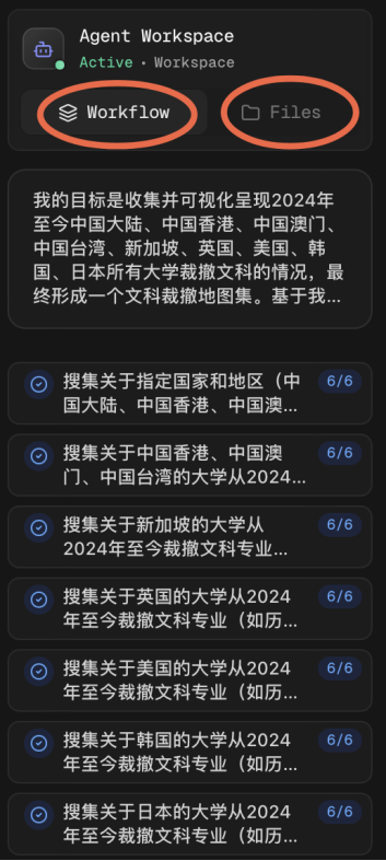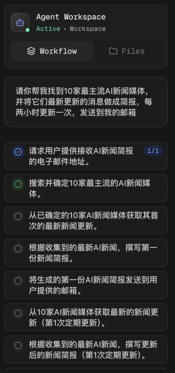 拿到提示词后,Neo 会先在左侧的 workflow 面板里自行规划出一整套清晰的工作流程,然后按步骤一项项执行任务。