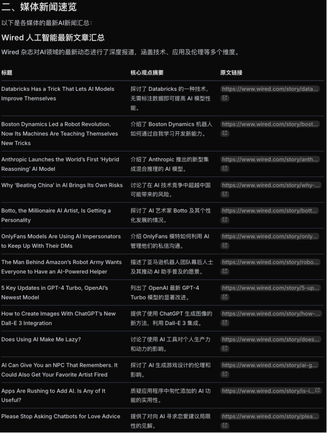 Neo会多线程同时处理10家媒体的信息抓取任务,并将所有信息整合做出一份简报: