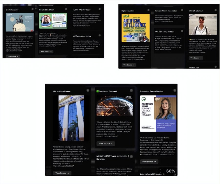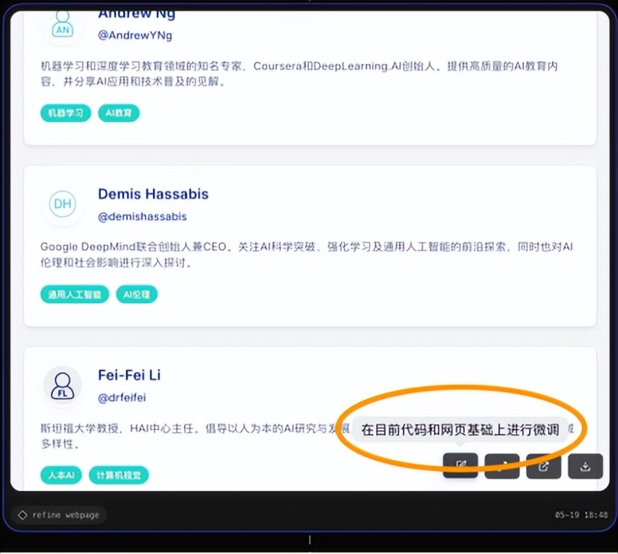 在这个网页中,它将奥特曼、杨立坤、吴恩达等一众X上的AI科学家和博主汇集在一起,为每个人贴上了标签,并实现了交互功能。每个名字下方还附有该博主在X上的链接,用户可以一键直接访问。