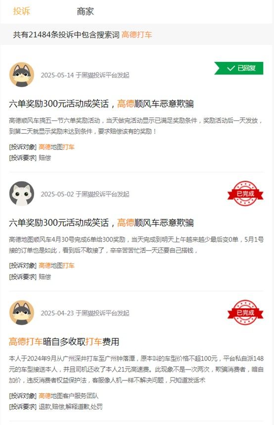 据相关数据显示,在消费调解平台黑猫投诉上,以“高德地图”为关键词的相关投诉多达38738条,其中“高德打车”的投诉量也达到了21484条。这3.8万条投诉,如同一面镜子,映照出高德打车背后的服务乱象。