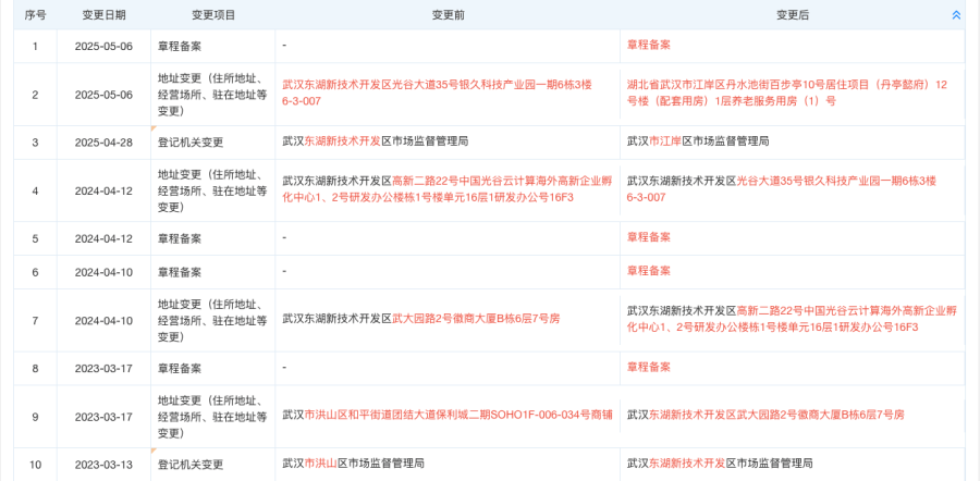 另外,在2021年成立至今,该公司4次变更公司地址,仅近一年就变更了3次。去年7月,该公司的办公地址由武汉东湖新技术开发区关山二路特1号国际企业中心某室,变更至武汉市东湖新技术开发区关东街道大学园路29号某室,在今年3月8日,又变更至武汉市东湖新技术开发区关东街道高新二路25号某室,在4月25日,又变更至武汉市东湖新技术开发区光谷大道77号金融港后台服务中心基地建设项目二期某室。