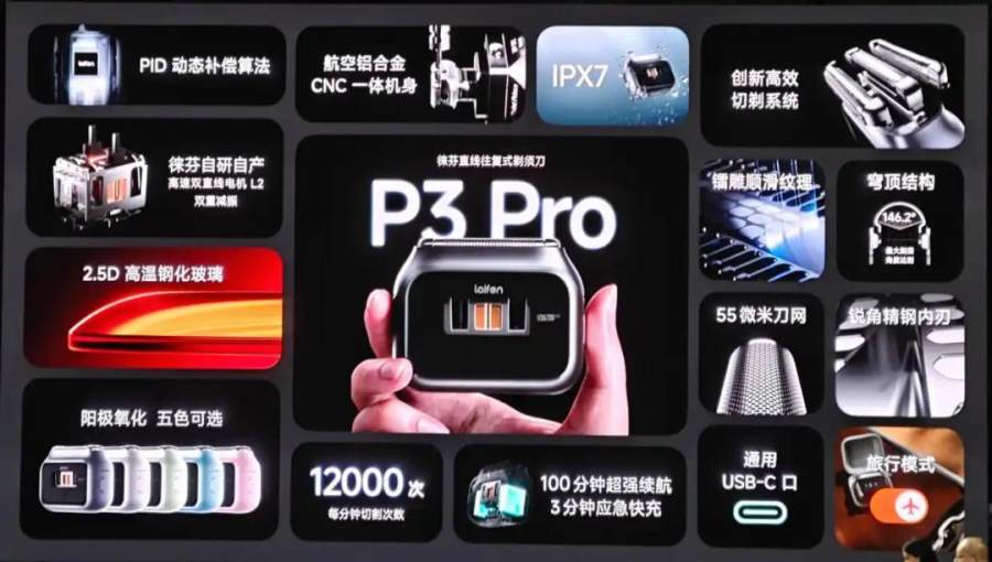 据了解,T1 Pro配备徕芬自研自产高速直线电机L1,实现每分钟12000次高频切割,动力损耗降低70%;而P3 Pro配备双直线电机 L2(强调双重减震),同样实现每分钟12000次高频切割。此外,两款产品均采用全铝合金CNC一体机身,支持IPX7防水和USB-C充电。