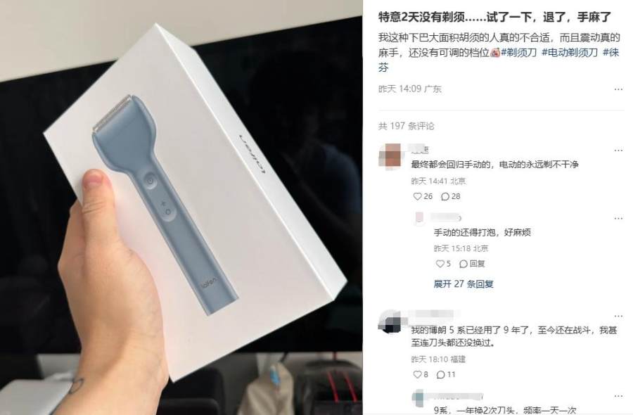 此外,还有体验过产品的网友表示,徕芬T1pro 噪音太大而且震动感太强甚至震的手麻;也有网友表示“剃不干净”。
