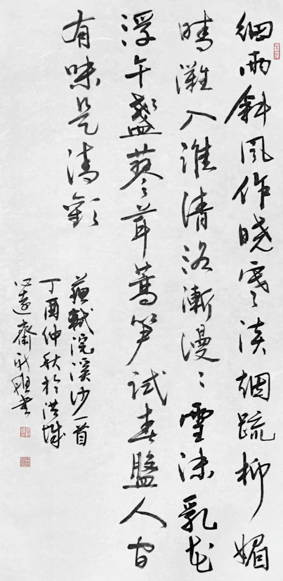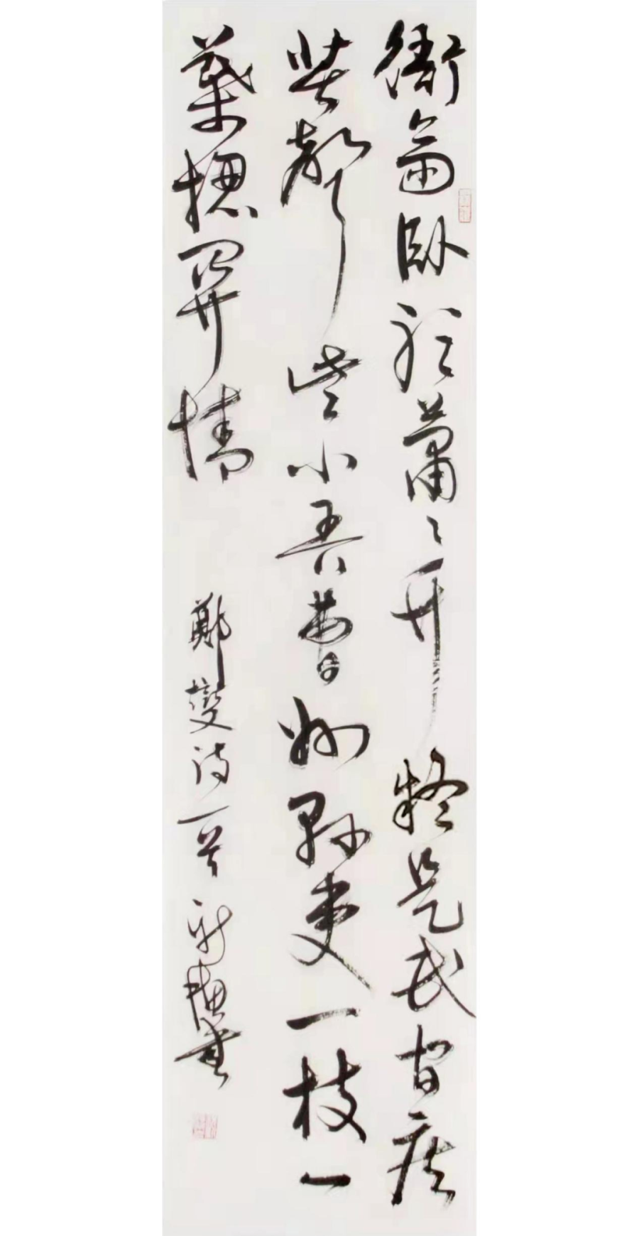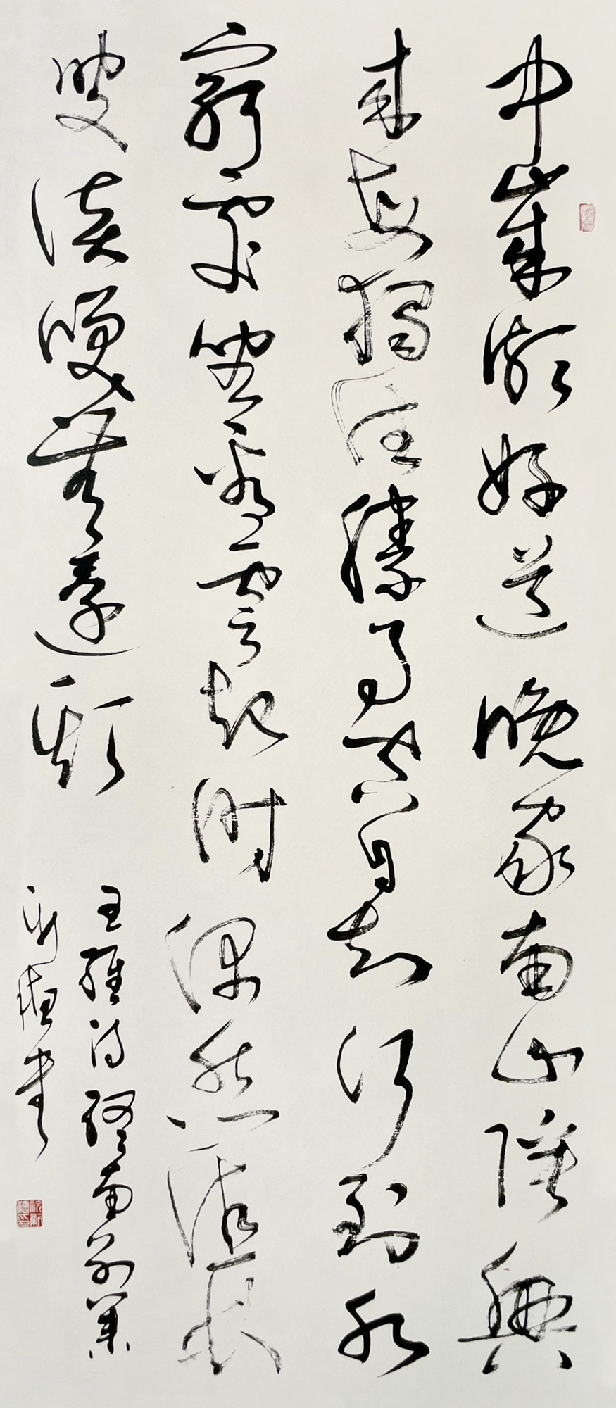 草书尤为所长。奔而不狂,急而不乱。线势连贯,笔断意连,纵逸之中藏法度,潇洒之际见筋骨。喜书古诗,尤取李白逸句、东坡高章。或挥毫如风动竹影,或顿笔似石压寒泉。诗情入纸,墨香绕指,一气呵成而自有天然之气。间有飞白之变,不为技巧炫示,乃性情所致。其法精密,其情澹远,诚为静观而后得也。