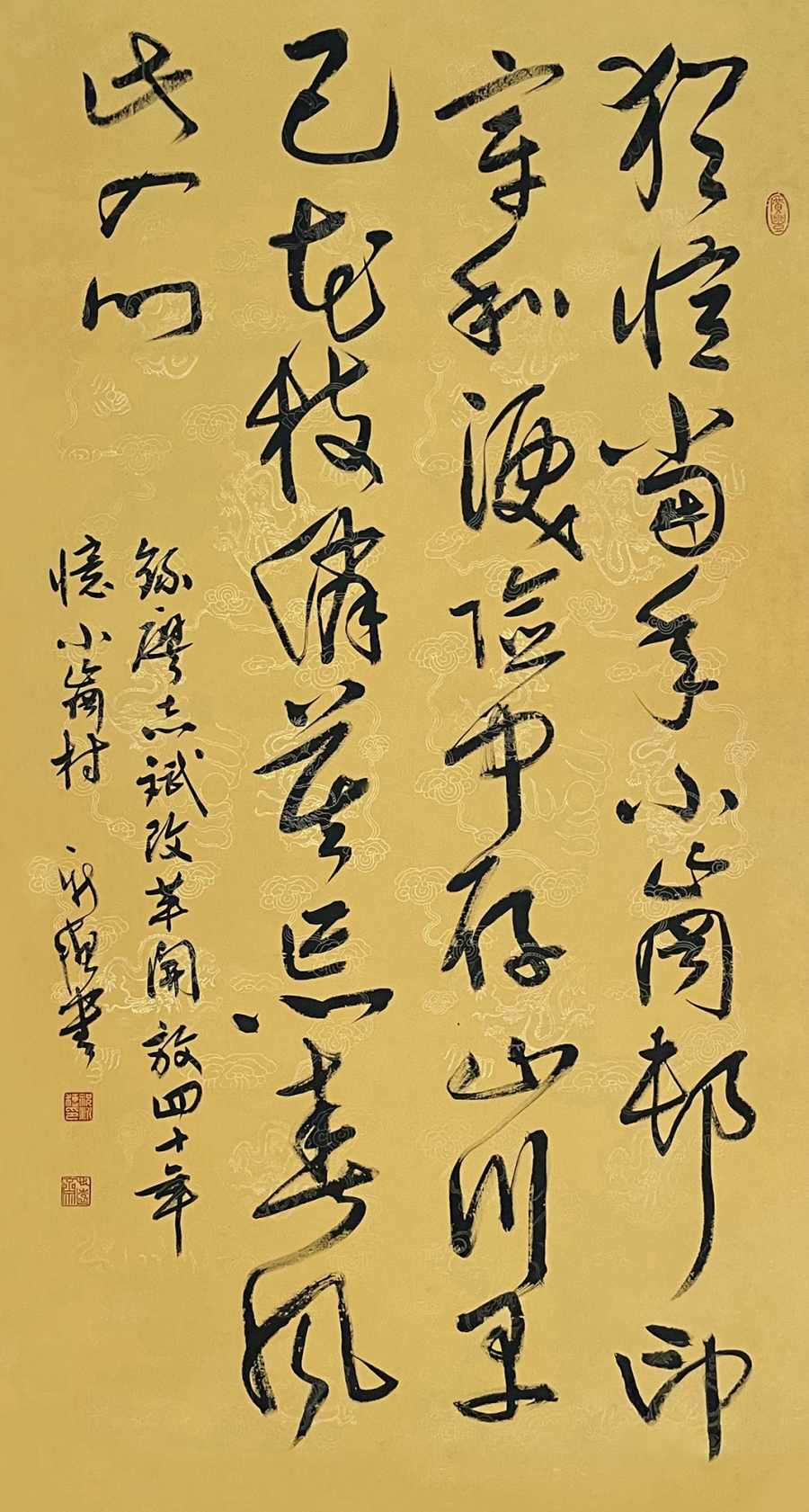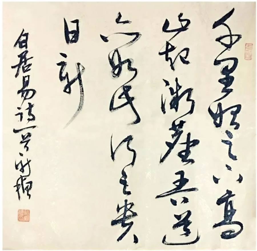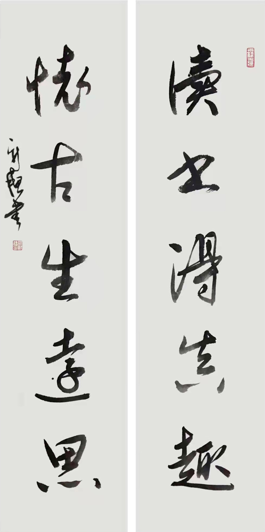 草书尤为所长。奔而不狂,急而不乱。线势连贯,笔断意连,纵逸之中藏法度,潇洒之际见筋骨。喜书古诗,尤取李白逸句、东坡高章。或挥毫如风动竹影,或顿笔似石压寒泉。诗情入纸,墨香绕指,一气呵成而自有天然之气。间有飞白之变,不为技巧炫示,乃性情所致。其法精密,其情澹远,诚为静观而后得也。