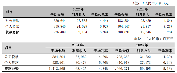 通过以下图表,我们可以清晰看到,宁波银行个人贷款平均利率长期高于公司贷款业务。2021至2022年,公私两大业务利息在2.5左右。即便2024年,个人贷款业务利率也要比公司贷款业务利率高近1.5个百分点。