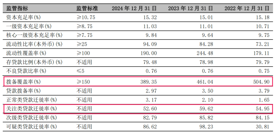 除关注类贷款外,近年宁波银行资产拨备覆盖率也在逐渐下滑。2022至2024年,宁波银行资产拨备率依次504.90%、461.04 %、389.35%。两年间,拨备率下滑了近115个百分点。