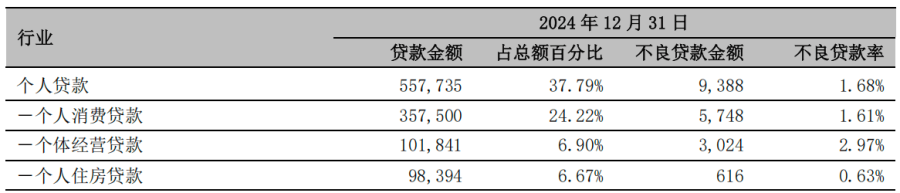相比,宁波银行个贷占比最高,2024末个贷规模占比近38%,2023年更是达到了40%。而在个贷中,占比最大的又是消费贷业务。