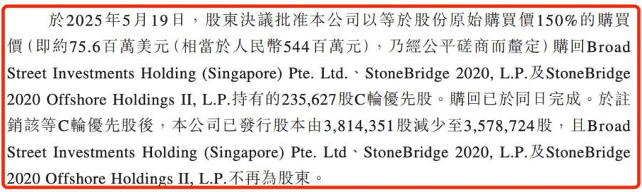 本次报考上市前,聚水潭曾在2025年5月斥资约7560万美元(约合人民币5.44亿元)向Broad Street Investments Holding (Singapore) Pte. Ltd.、StoneBridge 2020, L.P.及StoneBridge 2020 Offshore Holdings II, L.P.回购235,627股C轮优先股。
