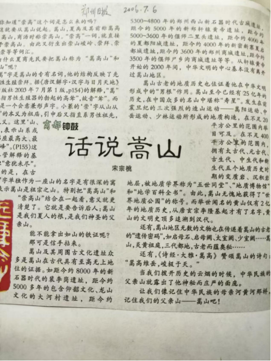 2006年6月15日,《大河报》刊登了宋宗祧的文章《嵩山——中华民族的父亲山》,这篇千余字的短文,如同一颗投向大海的巨石,激起了中原文化界的震荡。他从嵩山30亿年的地质年龄切入,指出其“万山之祖”的科学定位;又从甲骨文中“嵩”字的原始含义出发,结合《诗经》《史记》等典籍记载,论证嵩山在中华文明肇始中的核心地位。为了说服编辑刊发这篇“离经叛道”的文章,他多次登门拜访,以“说错了责任我来负”的担当,冲破了传统观念的桎梏。