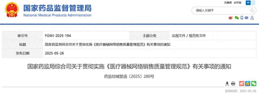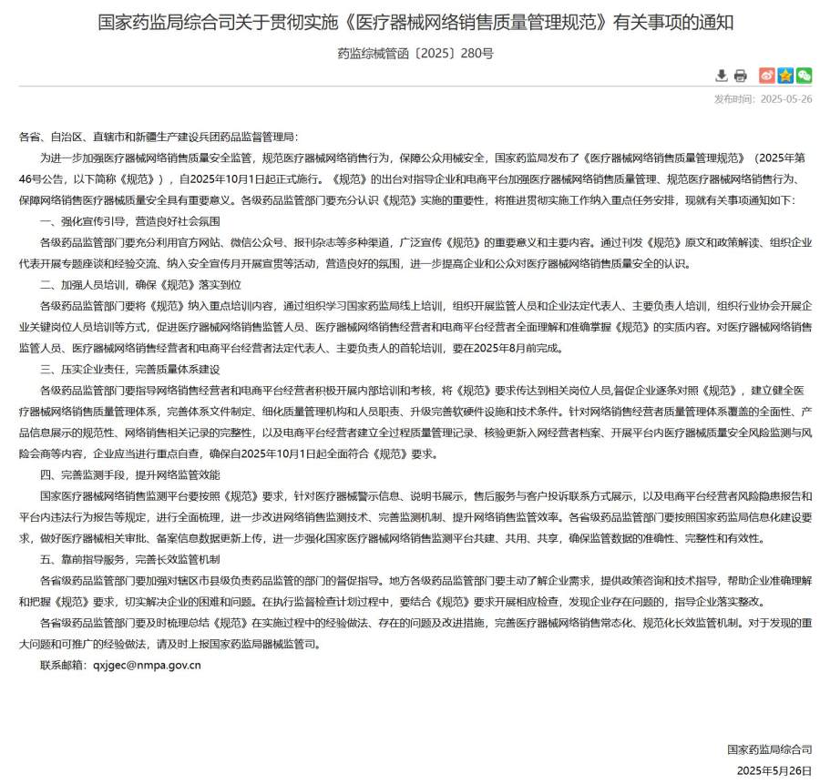 5月26日,国家药监局综合司发布《关于贯彻实施〈医疗器械网络销售质量管理规范〉有关事项的通知》,对即将于10月1日正式施行的《规范》作出全面部署,旨在加强医疗器械网络销售质量安全监管,保障公众用械安全。