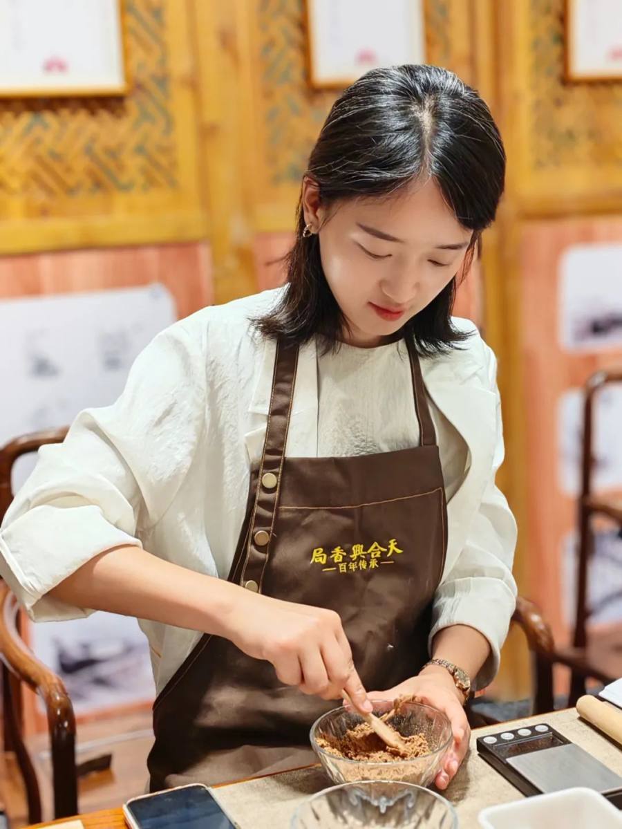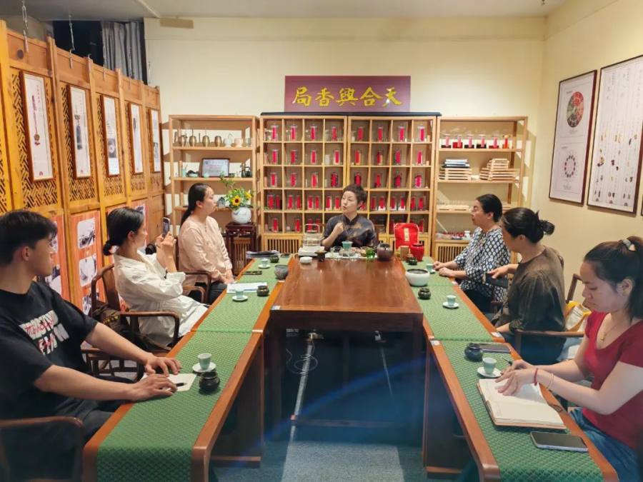 雅致古朴的“天合兴香局”内,学员们兴趣勃勃地参观了非遗传承谱系、制作技艺图和各种手工香品后,李彦妍老师点燃了象征着薪火传承的线香,逐一传递给学员,学员们依次入座,将线香摆入面前的卧香炉内,打开专用教材和辅导资料,屏息凝神,期待着即将开启的跨越千年的文化对话。