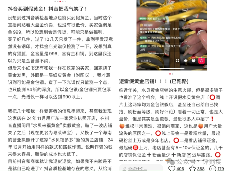 而另一位网友则提到自己在抖音直播间买了好几件黄金饰品,“过了10天只发了一件,拿到手发现竟然没有钢印,才找到金店光谱仪检测了一下,没想到真的有猫腻,金含量是996,含有金和铜……后来我发现这家店在24年11月用广东一家营业执照开店,在抖音直播间用“水贝来福黄金”卖假黄金,骗了一波,店铺关门后,又换了一个海南的营业执照开了这家水贝福多多的黄金店铺,24年开始用同样的款式和路数诈骗。”