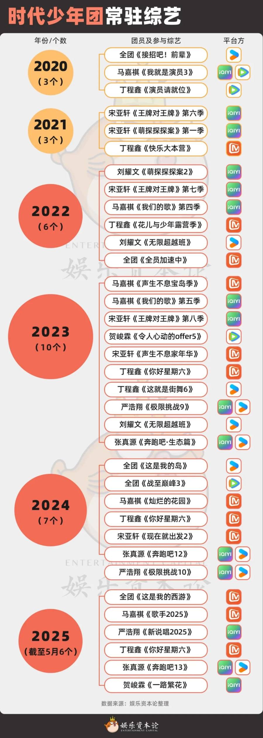 在出道的前两年,时代少年团综艺数量还不显眼,每年只有3个左右的常驻综艺。