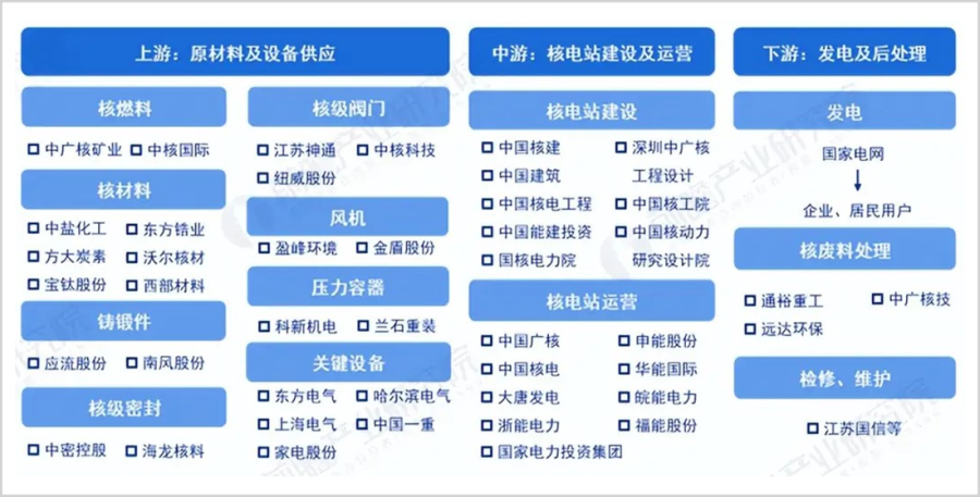 做核材料中盐化工、方大炭素,做核岛关键设备的东方电气、上海电气,做锻铸件的应流股份和南风股份,做阀门的江苏神通,做压力容器的兰石重装……
