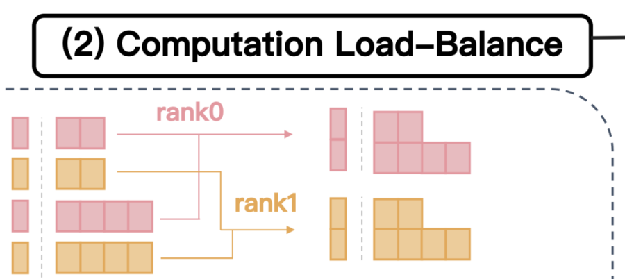 换句话说:如果一个 attention mask 的非零区域( 未被遮挡的区域 )越大,那它所对应的计算负载就越重;所以我们可以通过估计 attention mask 中 “ 未被遮盖区域的面积 ”,来判断每台机器的任务量大小。在 CP 设置中,我们会把一个很长的序列拆分给多台机器,每台机器负责其中的一段。我们通过事先分析这些段所对应的 attention mask,然后采用一些策略,尽量让不同机器处理的掩码面积相等, 从而使任务负载趋于平衡,进一步提升训练效率。