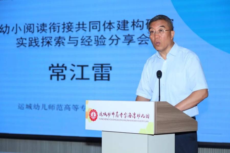 党委书记常江雷致辞,对与会人员表示欢迎,对附属两所幼儿园的研究成果表示祝贺。他指出幼小衔接是时代所需、教育之要,此次实践分享以阅读为切入点、共同体为载体,实现了课程资源、教师研修和家园协同的“三个优化”。未来,幼师高专将深化实验成果,推进研究深度,拓展实践广度,加大协同力度,为运城教育高质量发展贡献新的力量。