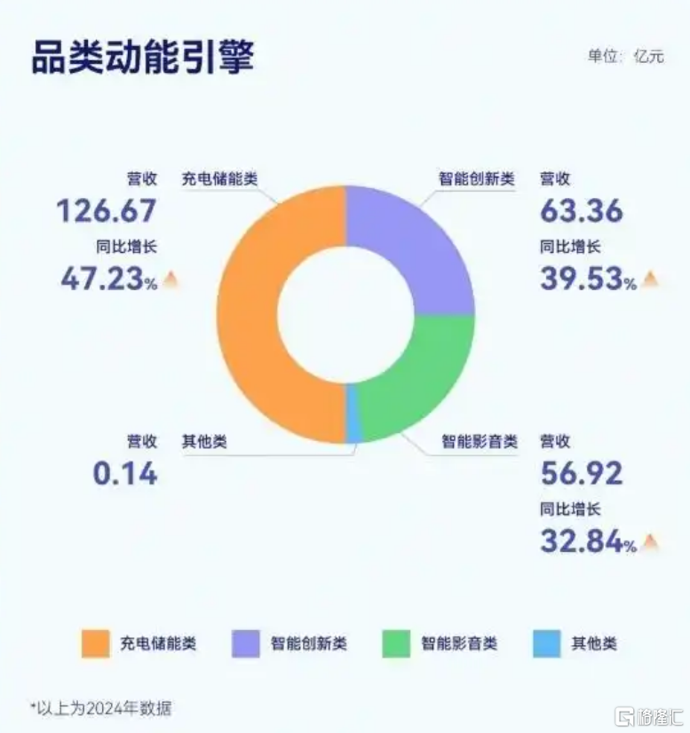 相关数据显示,安克创新在充电储能、智能创新和智能影音三大品类中均表现出色,尤其是储能业务成为新的增长引擎。据悉,包括充电宝、充电器等品类在内的充电储能类产品在2024年表现尤为突出,贡献了126.67亿元的收入,同比增长47.23%,占总营收的51.26%。