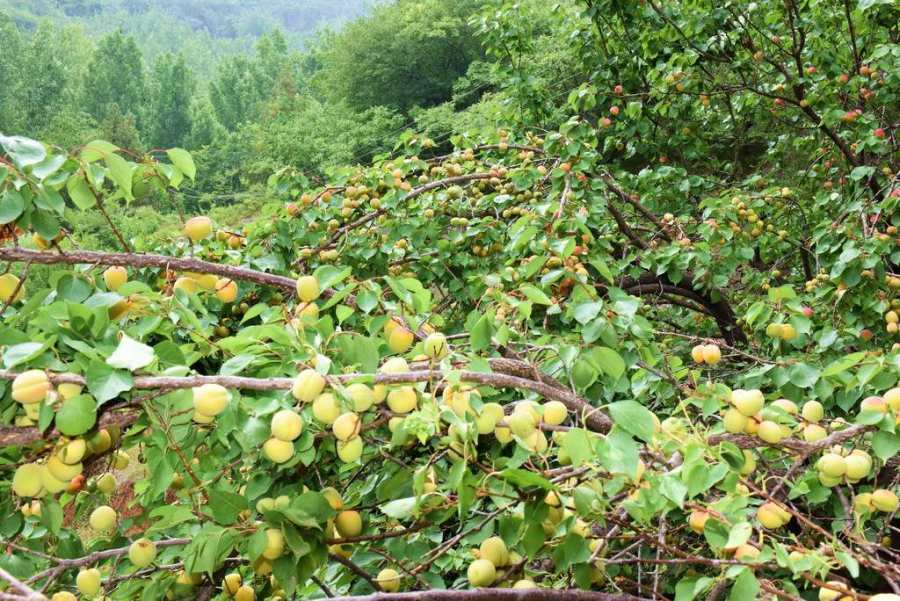 笔者和妻子来到山湾里,两户始建于近年的两户人家,当初建房时,这些砖瓦用什么工具运进深山老林的?就是眼前条件,也不可能用机器运进来,可惜的是,如此漂亮的小洋楼已经人去楼空。看着门前石墙边枝头挂满金黄色杏子,压弯枝头的杏树,让人流出满口酸水。