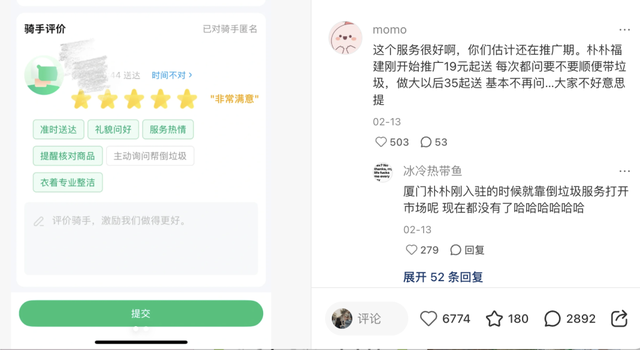 此外,朴朴超市的服务差异化还体现在,让福州市场消费者满意度颇高的帮客户“捎垃圾”服务。这一服务通常在新市场推广期备受重视,时至今日在社交媒体平台上,依旧有不少用户对这一服务表达了意外和感叹。