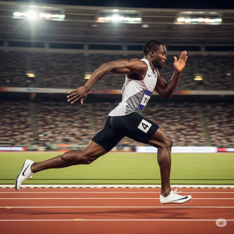 短跑运动员进行100米冲刺。步频和步幅达到最佳状态。相机沿跑道侧面高速跟随,保持与运动员同步移动。跑道表面略有震动,看台观众为背景。运动广告风格,高对比度,肌肉纹理清晰,速度线条动感强烈。