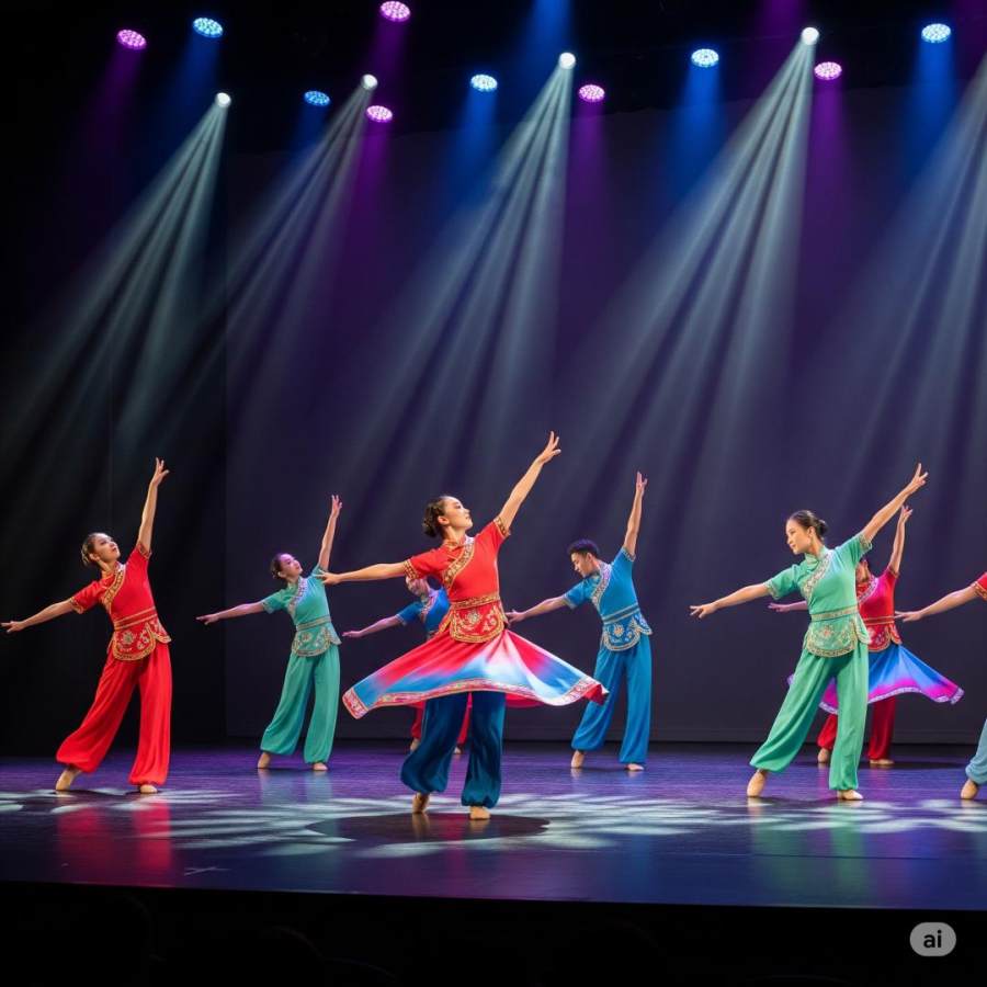 多名舞者在舞台上进行同步舞蹈。舞者有节奏的动作,中间的主舞者旋转跳跃,其余舞者形成队形流动。镜头绕舞台缓慢旋转。舞台灯光随动作变化节奏切换,整体呈现流动舞台感。音乐剧舞台风格,镜头稳定流畅,强调集体节奏与个人动作张力,光影配合表演节拍变化。