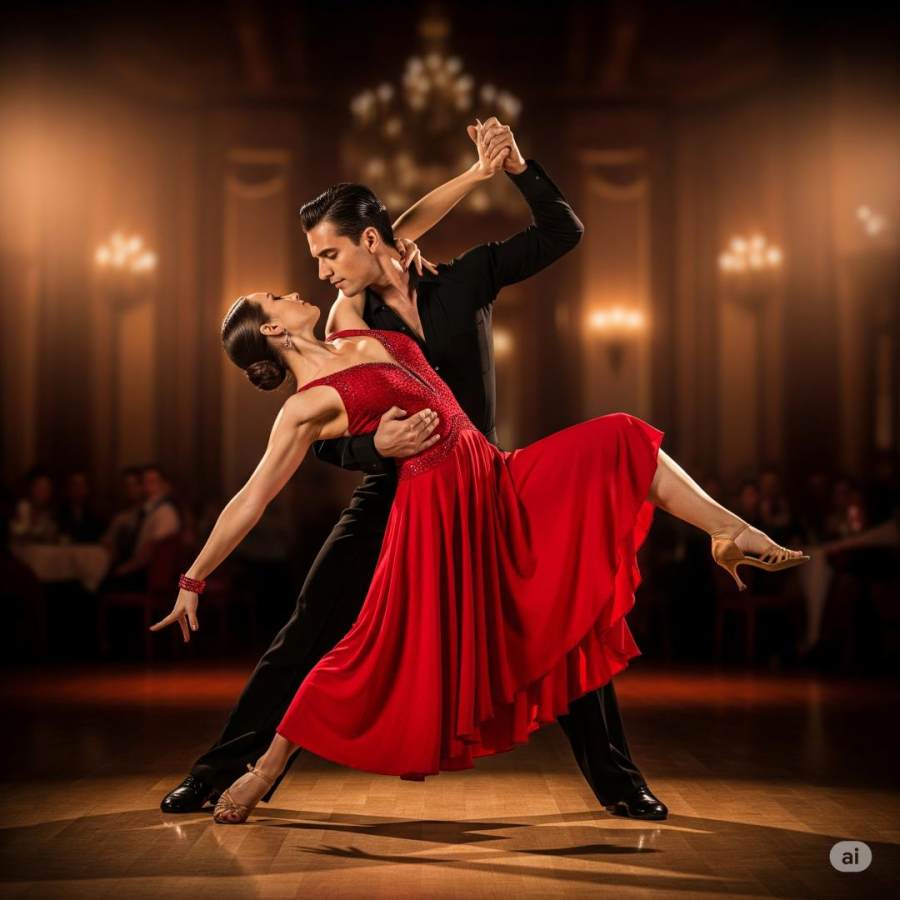 专业舞蹈演员表演拉丁舞。男女舞伴身体贴近,女舞者被男伴带领做旋转和倾斜动作,动作充满张力和激情。相机围绕舞者做弧形运动,时而拉近捕捉精彩动作,时而拉远展现整体舞姿。女舞者裙摆在旋转中飞扬,舞台灯光随节拍变化,观众掌声此起彼伏。舞台表演风格,戏剧化光影,色彩浓郁,强调舞者间的化学反应和情感张力。