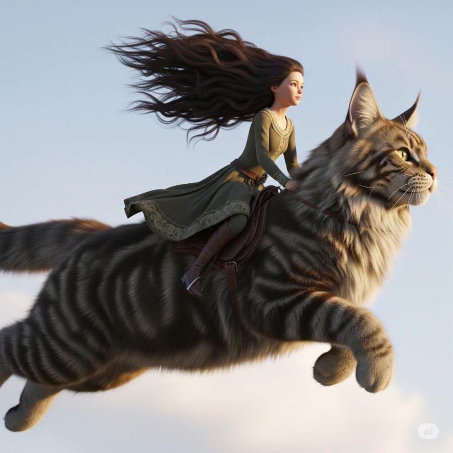 一位长发少女骑着一只巨大的缅因猫在空中飞行,镜头跟随她们穿越高空云层,展现少女飘动的发丝与猫毛在风中流动的细节。写实风格,真实模拟毛发在风中动态变化的物理特性,光影细腻、色彩自然,整体画面具有电影质感,镜头语言强调速度与毛发动势的张力,整体构图强调空间层次与纵深感。
