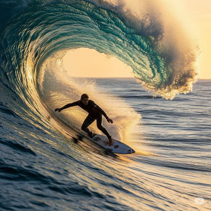 冲浪运动员在大浪上展现精湛冲浪技巧。冲浪者在浪墙上保持平衡,身体随浪形调整姿态,完成转弯和加速动作。相机跟随浪花运动。海浪翻滚产生白色浪花,海水深蓝色泽,远处天空云彩变化。极限海洋运动风格,自然光线充足,蓝色和白色主导,突出人与自然的和谐较量。