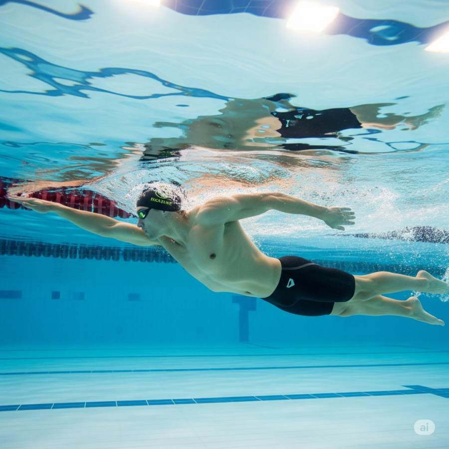 一名专业游泳运动员在泳池中进行自由泳训练。游泳者身体在水中以流线型前进,手臂交替划水,腿部规律打水推进。相机在水下拍摄,跟随游泳节奏。池水清澈透明。专业游泳训练风格,蓝色主调,强调技术动作和水中流畅感。