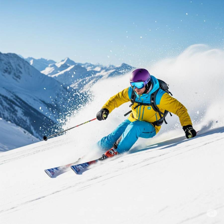 滑雪运动员从雪山坡道高速滑降,滑雪板切割雪面激起雪浪。相机从侧面跟随下降轨迹。雪面反射阳光,山景壮丽为背景。冬季运动风格,高反差雪景,色彩鲜艳的装备突出,强调速度与自然环境融合。