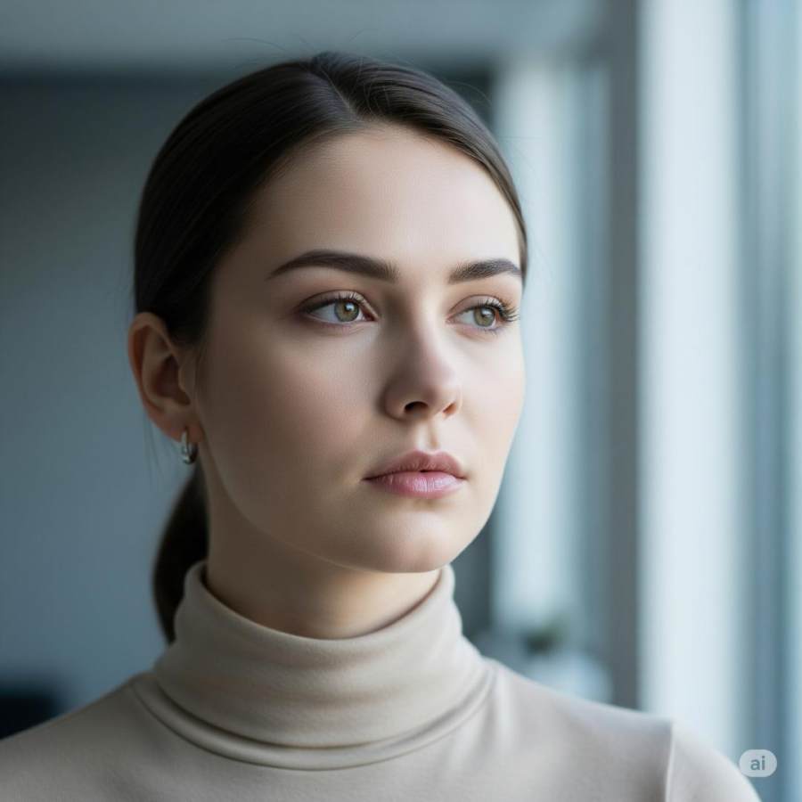一个电影风格的中近镜头,一位年轻女子凝视远方,起初面无表情。慢慢地,她的目光开始聚焦,眉头微微皱起,嘴唇轻轻颤抖。突然,她眨了眨眼,眼角涌出一颗泪珠,却又没有落下。没有对白,只有面部表情。风格:超写实或电影级CG,浅景深,柔和的冷光,微妙的情感张力。镜头:静态特写或慢速推拉。