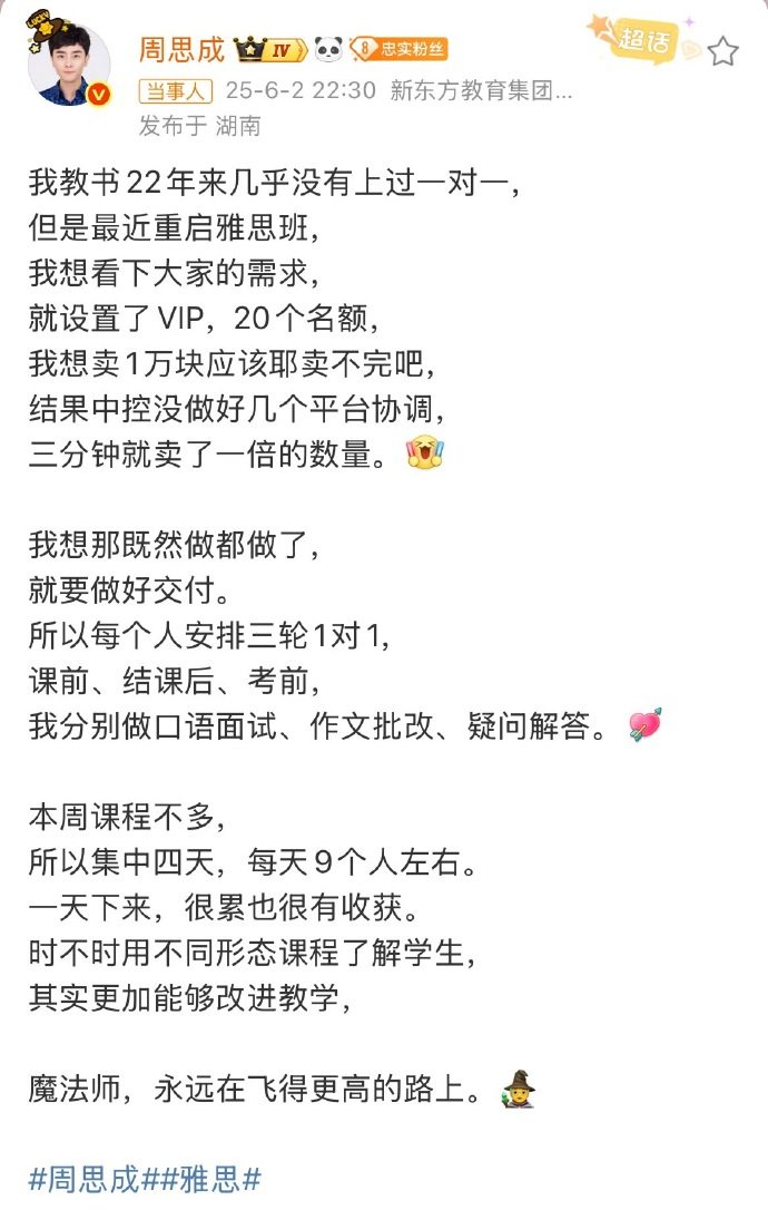 6月2日,周思成发文透露重启雅思班,并开放20个VIP名额。他坦言本以为定价1万元的课程可能卖不完,但因多平台协调疏漏,导致名额三分钟内超售一倍。