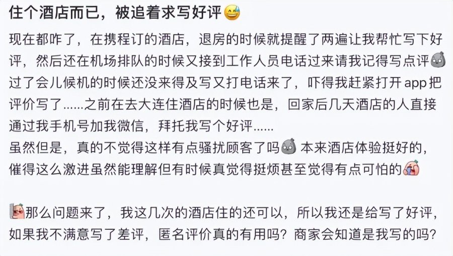 这种通过诱导获得好评的方式,不仅让很多顾客不舒服,也让酒店评分的客观真实性大打折扣。