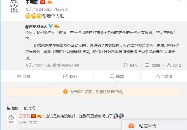 2017年的乌镇互联网大会上,刘强东在演讲中提到“今天我们一部分人已经富起来了,富到了赚一个亿都是小目标”,被指公开调侃王健林。面对刘强东的调侃,王思聪显然“记仇”了。2018年美国明州事件之后,王思聪公开转发并评论京东官方辟谣微博称“价格没谈妥”,隐含深意。