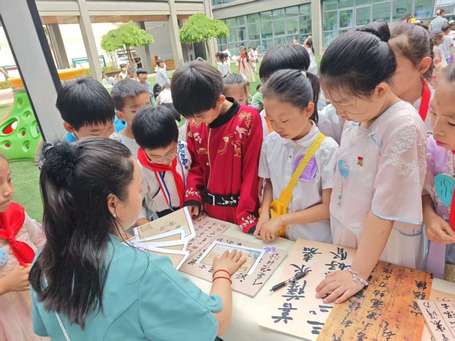 “金文招牌是孩子们用毛笔写的,就连摊位编号都是用隶书标注的。”学校党总支书记陈绍花介绍,活动的每个细节都经过精心设计: