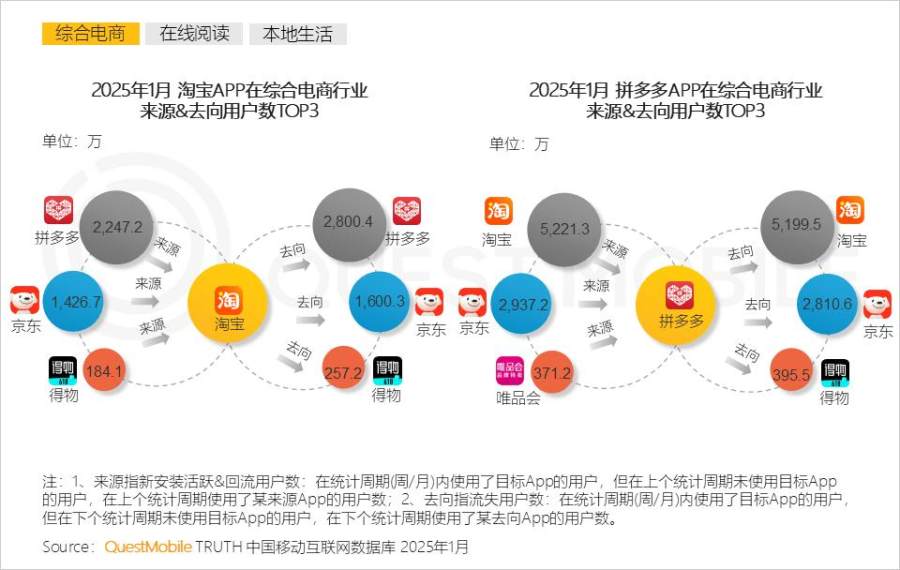QuestMoblie 数据统计,综合电商领域,淘宝与拼多多 App 互为双方流量来源与去向用户数最多的平台。行业竞争激烈的同时,用户消费跨平台购物的倾向愈发明显,人手 3 个以上电商 App 已是常态。