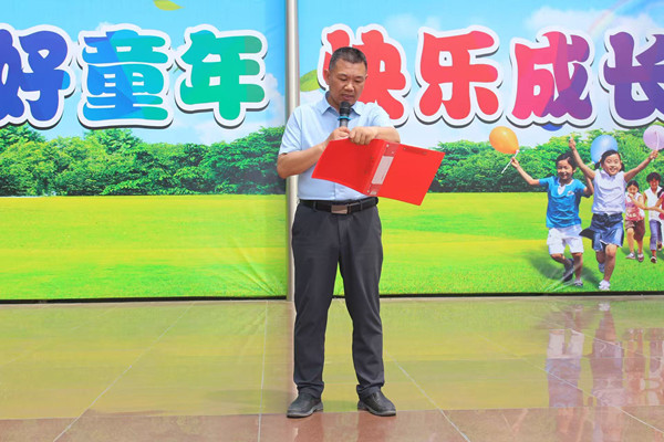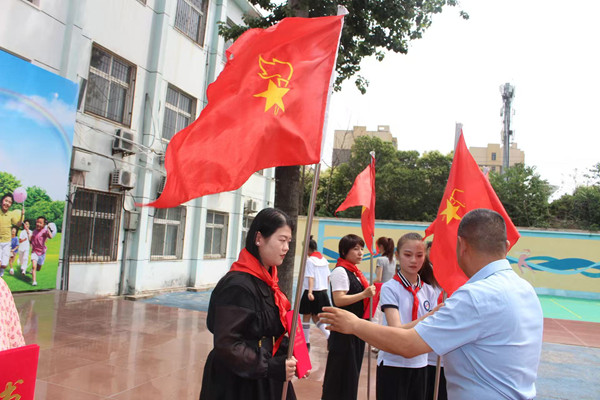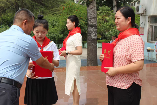 潘校长为新建中队授中队旗并颁发辅导员聘书。潘校长深情寄语新队员,他希望同学们不忘入队初心,牢记光荣使命,学好知识,练好本领,争做新时代好队员。