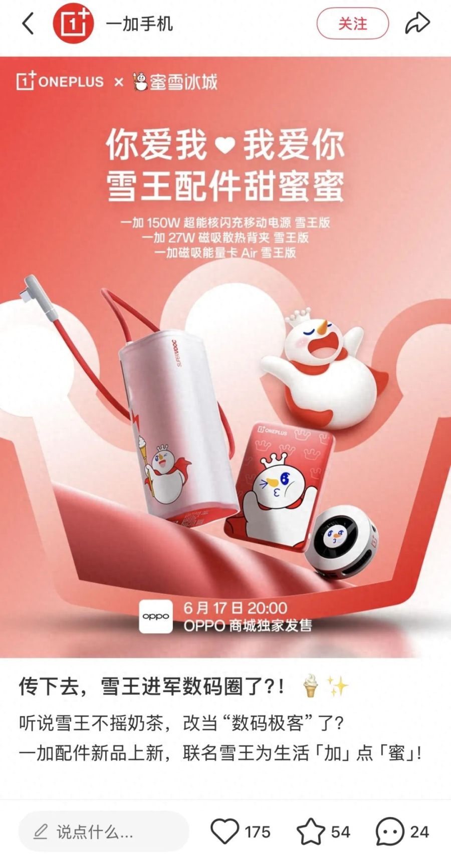 前阵子,蜜雪冰城的IP“雪王”跟手机品牌一加牵手,推出了移动电源、散热背夹等限定主题系列配件,粉丝们直呼“这联名太野了”;