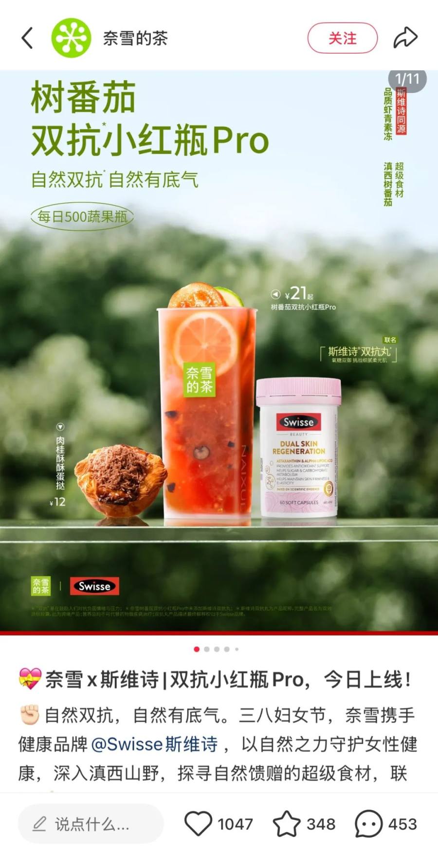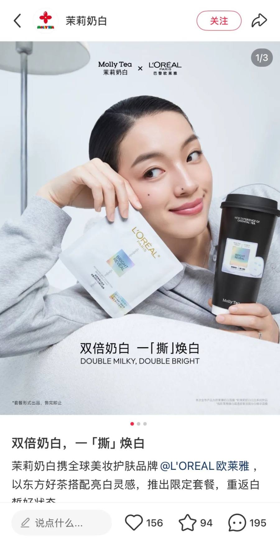 奈雪的茶与Swisse的合作则是强化了奈雪的“健康”属性、茉莉奶白与巴黎欧莱雅的联名顺势推出了欧莱雅的新品奶白面膜。