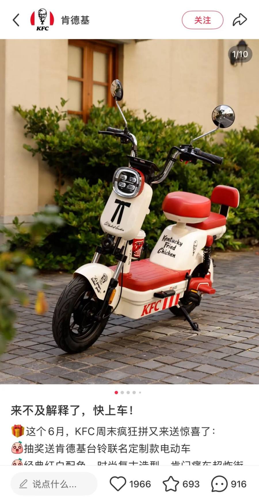 无独有偶,近期肯德基也预告将与台铃电动车联名,且预备了2000台限定联名款电动车进行抽奖,复古的造型还引发网友“能不能直接量产上市卖”的呼声。