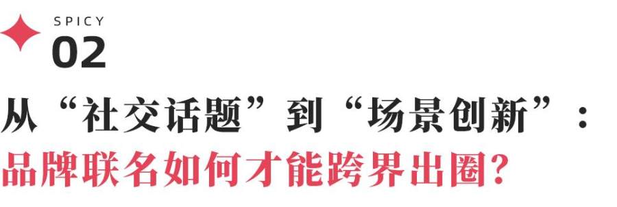 剁椒Spicy对比发现,虽然同为联名营销,但品牌与品牌与品牌与IP之间的联名逻辑有很大差异,品牌联名想做出圈,本质上更难,需要更深层次的话题挖掘、更创新的消费场景。