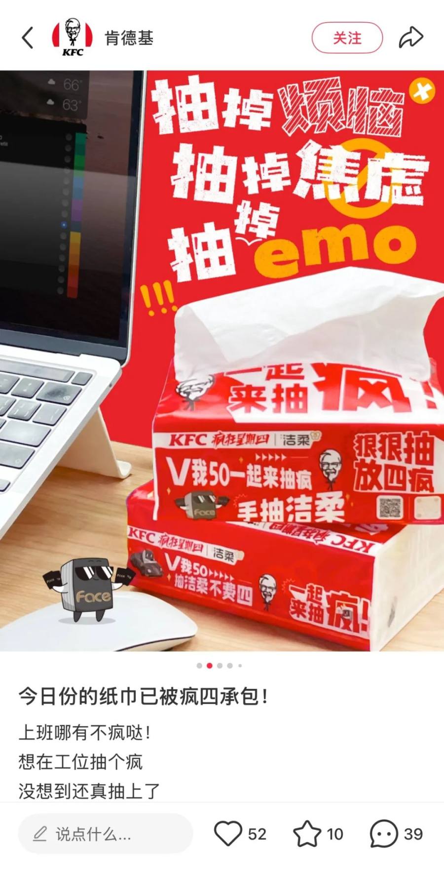 结合社交情绪,主动玩梗、造话题。因为品牌与品牌之间的联名本身缺乏天然的情绪共鸣,但社交话题是一个很好的讲故事的契机,能够借此与消费者同频。例如此前肯德基与洁柔的联名,就契合了互联网上的“发疯文学”,组成了“疯搭子”、推出了周边“抽疯纸盒”,并以“V我50一起来抽疯”的slogan将肯德基原本的“疯狂星期四”的营销活动和此次联名活动深度结合。
