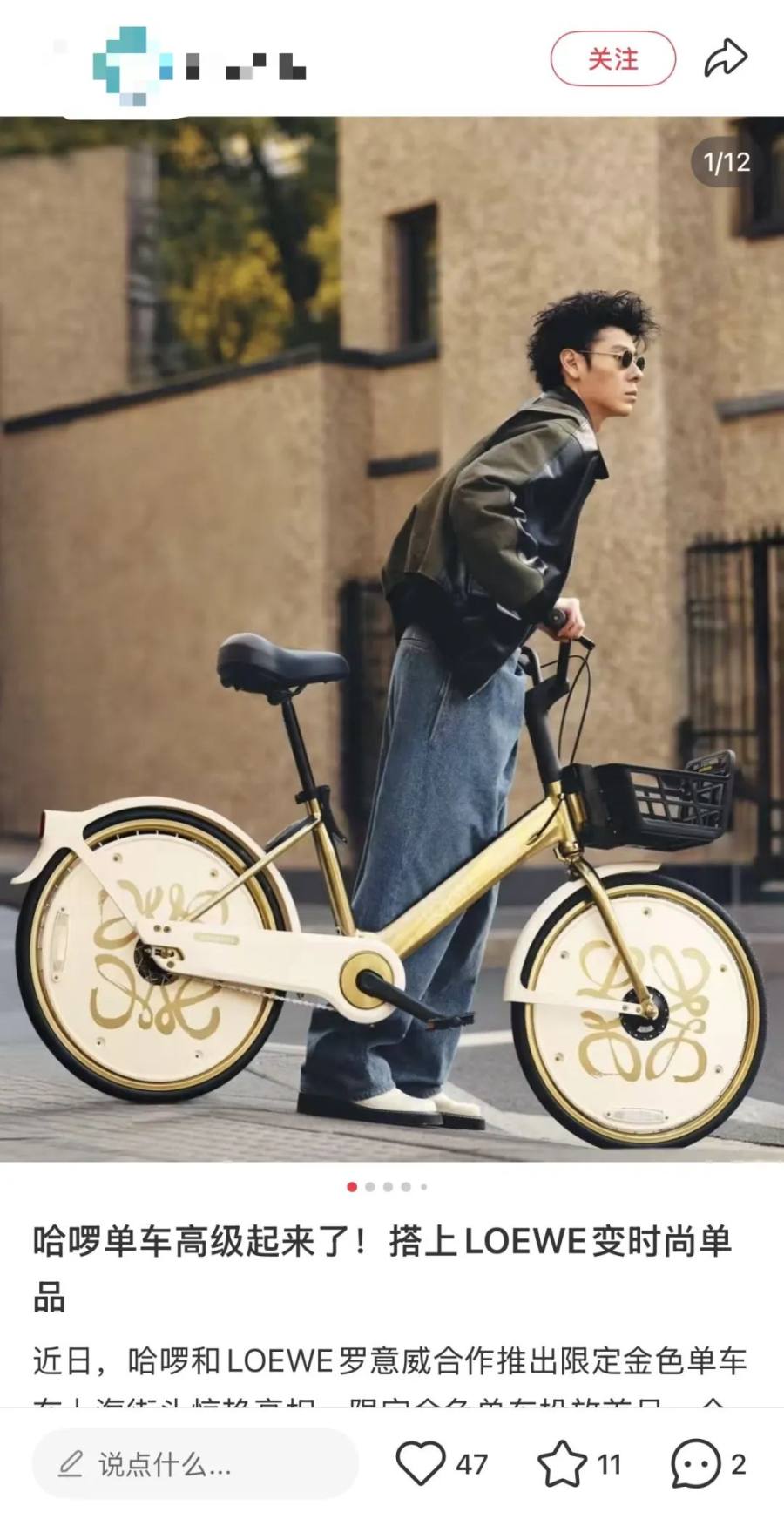 而今年上半年哈啰单车与Loewe的联名,不仅推出了限量的联名款单车,哈啰APP还上线了“金色骑行挑战赛”,吸引消费者前往上海罗意威之家,而该合作在一定程度上也迎合了“调侃大牌”的爽点,诸如“罗意威你也是好起来了,能跟我们哈啰联名上”的调侃。