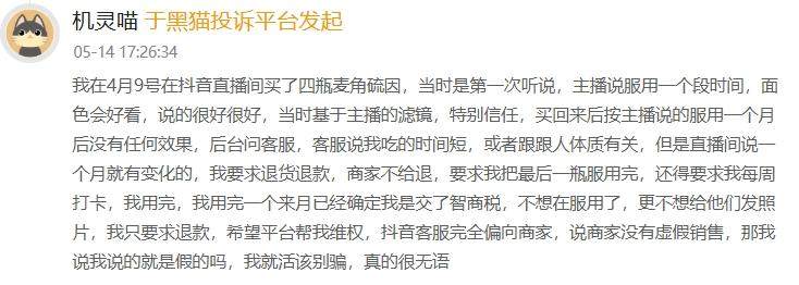 当然,还有不少网友表示吃完效果并不明显,只当是吃个心理安慰。在“黑猫投诉平台”上有消费者投诉称,直播间购买时说吃一段时间面色就能面色变好看,结果吃完并没有任何效果。