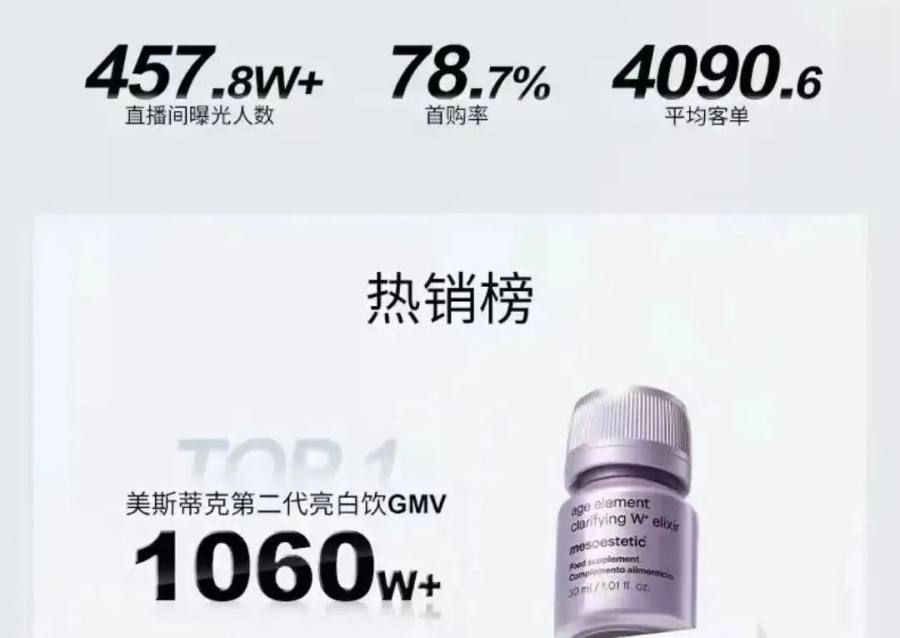 美斯蒂克销量最拔尖的是一款亮白饮,号称使用了珍稀海岸松提取物、法国甜瓜SOD、美洲水晶白番茄等多种美白、抗氧化的成分,天猫旗舰店上单盒售价857元。今年618期间,美斯蒂克这款亮白饮在抖音单日GMV突破千万元,全渠道GMV为4000万元,同比增长50%。