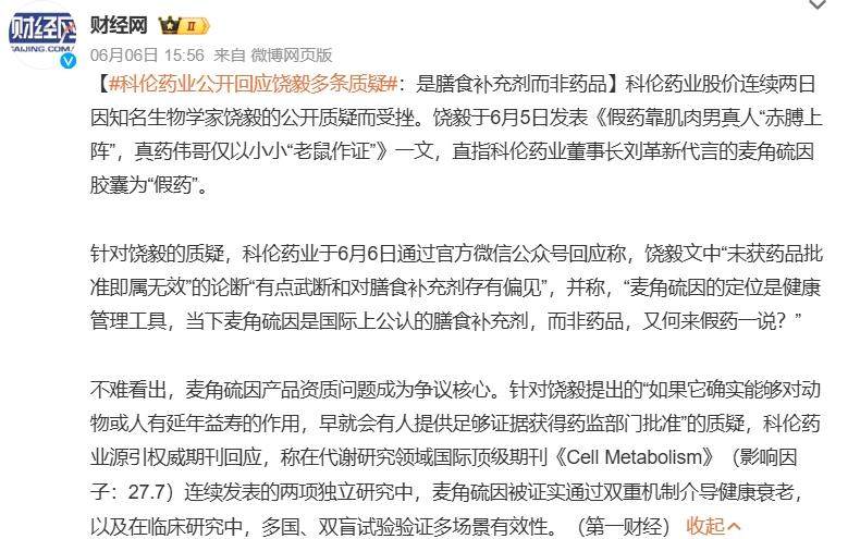 针对饶毅的质疑,科伦药业回应称,饶毅文中“未获药品批准即属无效”的论断“有点武断和对膳食补充剂存有偏见”,并称,“麦角硫因的定位是健康管理工具,当下麦角硫因是国际上公认的膳食补充剂,而非药品,又何来假药一说?”