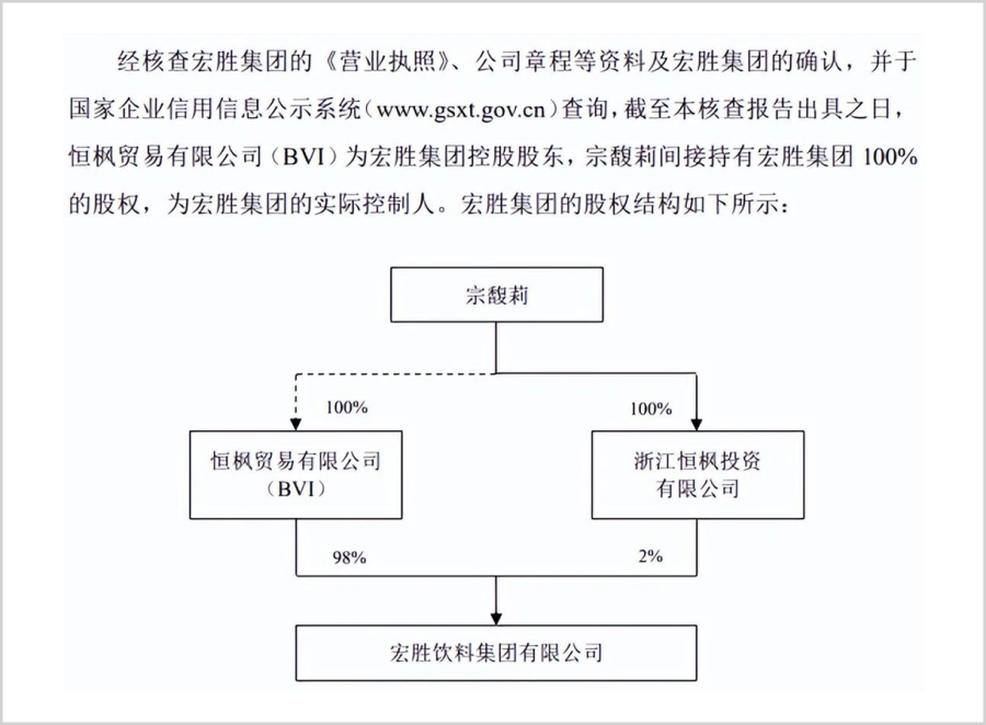 宏胜集团是娃哈哈管理层在2003年单独成立的公司,主要从事娃哈哈产品代加工业务,宗馥莉从2007年便开始执掌这家企业。2022年,上市公司万凯新材曾披露作为战略配售投资者的宏胜集团的相关信息,显示宏胜集团已经由宗馥莉100%持有。