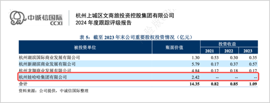 来自中诚信国际的一份跟踪评级报告似乎也从侧面反应出了这一问题,报告显示,作为娃哈哈第一大股东的杭州上城区国资2021年-2023年对娃哈哈集团的投资收益为0,账面价值也只有2.42亿元,这和娃哈哈公布的盈利体量显然不匹配。