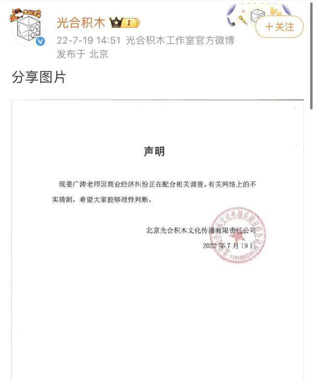 2022年7月, 网络上有传闻称“配音演员姜广涛疑似被警方带走”,随后姜广涛担任创始人和股东的光合积木配音工作室发布官方声明确认姜广涛“在配合调查”,将原因定性为“商业经济纠纷”。2023年吼浪工作室发布声明,称公司宋明/王雪及外部人员姜广涛、宋扬共同实施了重大的涉嫌刑事犯罪的经济活动,使得舆论进一步升级。